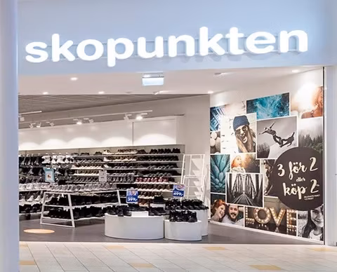 Skopunkten på Kupolen i Borlänge hittar du alltid ett stort utbud av aktuella skor till låga priser. Du handlar smart till hela familjen då det är förmånligt att köpa fler par samtidigt.